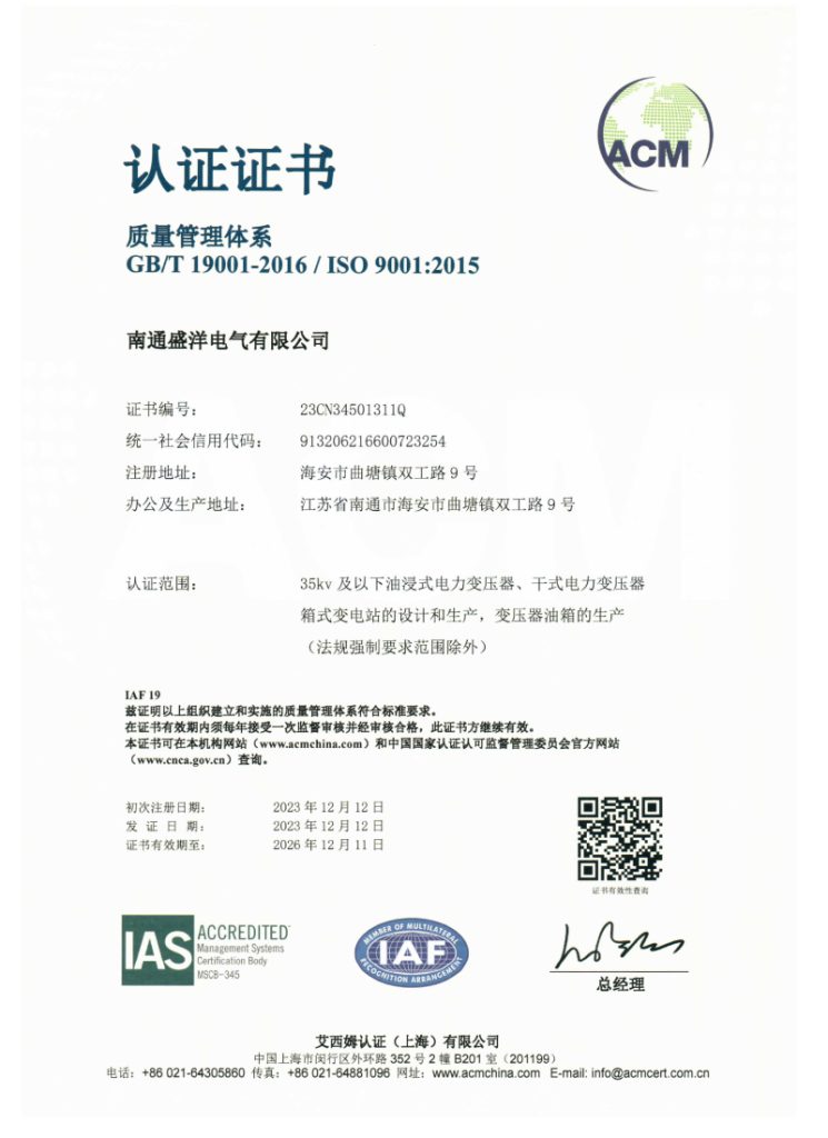 盛洋电气通过了ISO9001质量管理体系、ISO14001环境管理体系、OHSAS18001职业健康安全管理体系等认证。
